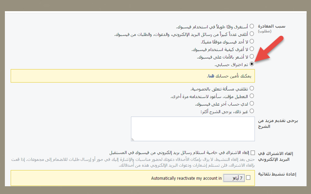 بعد الدخول ضع علامة على تم اختراق حسابي كما في الصورة :