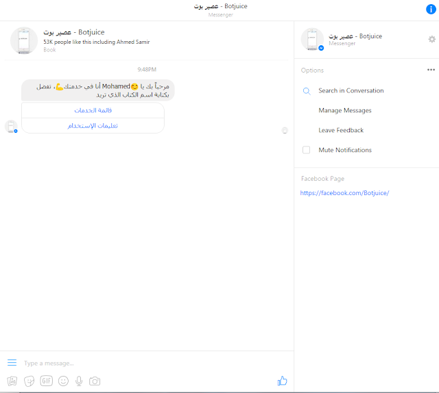 خدمه عصير بوت هو عباره عن حساب على مواقع التواصل الاجتماعى فيسبوك ماسنجر مربوط مع موقع book juice والذى يدعى مكتبه عربيه كبيره وضخمه