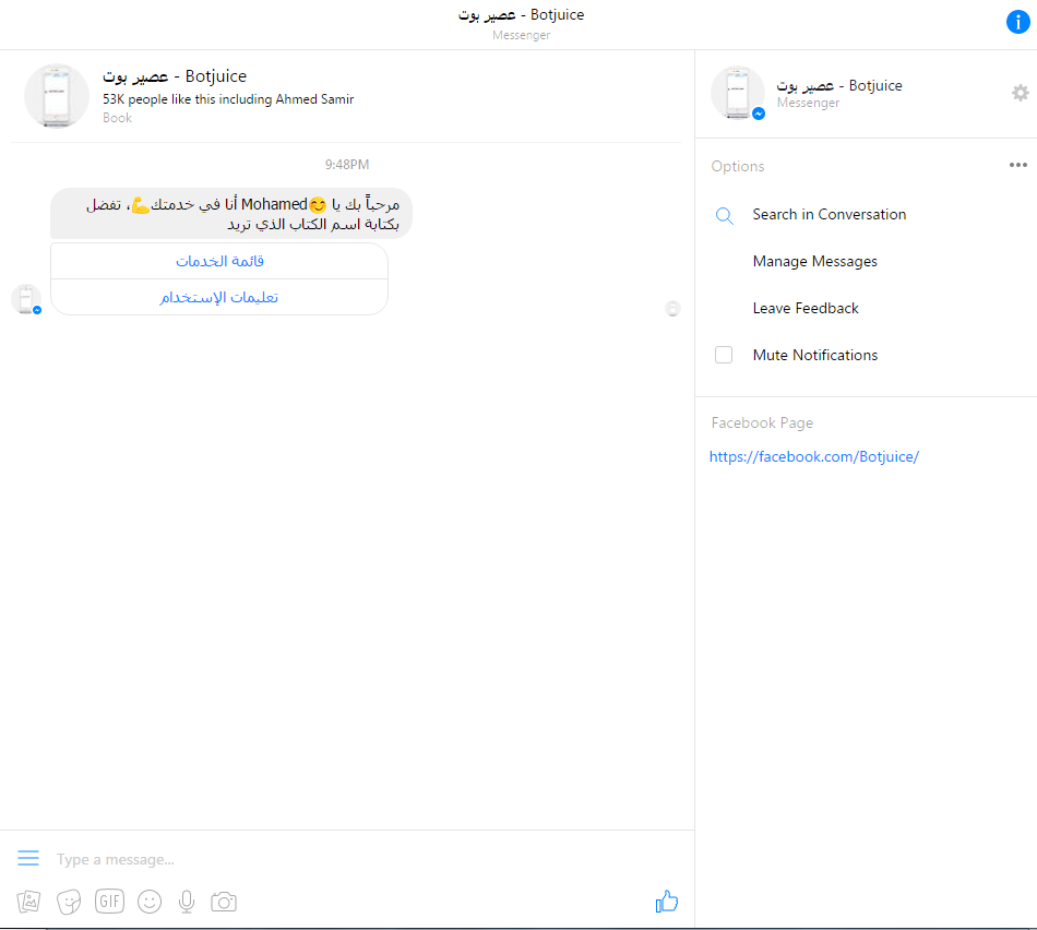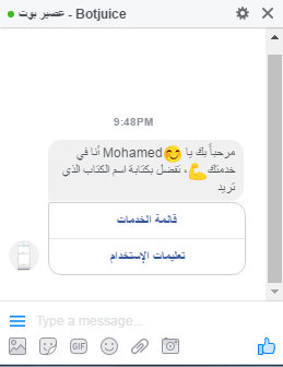 خدمه عصير بوت هو عباره عن حساب على مواقع التواصل الاجتماعى فيسبوك ماسنجر مربوط مع موقع book juice والذى يدعى مكتبه عربيه كبيره وضخمه